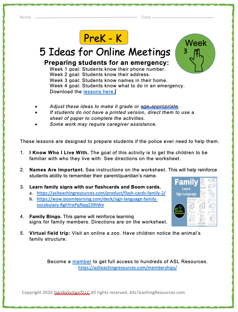 What’s included? 4 pages of fun educational, interactive ideas with sign language in mind. Teachers choose which of the 5 activities to use each day to support online meetings. Adjustable for one-on-one use or group interaction. Can be used even if students do not have the printed handout.
